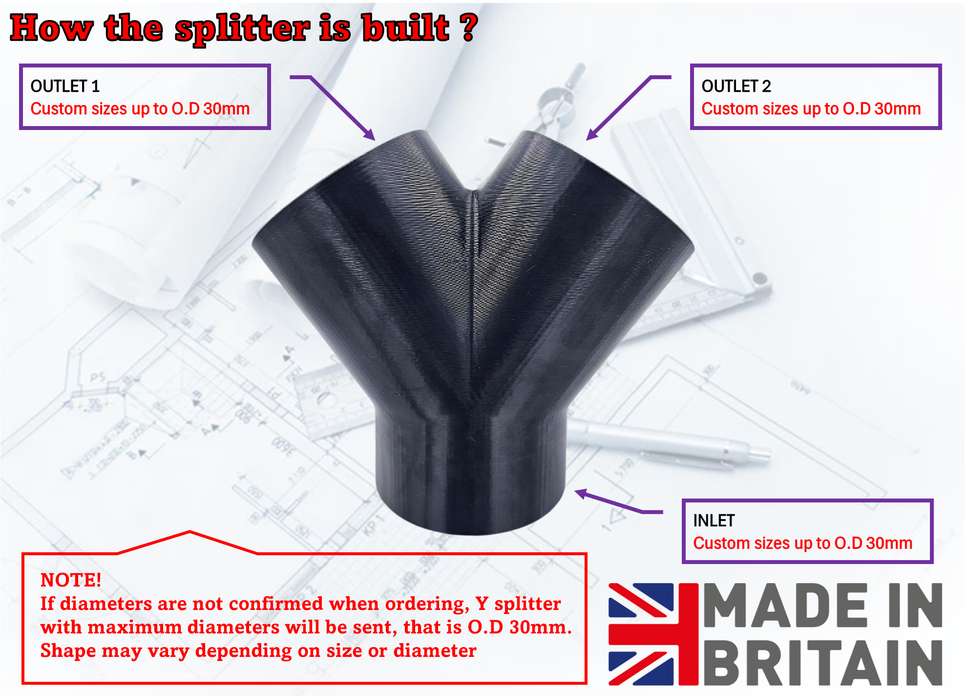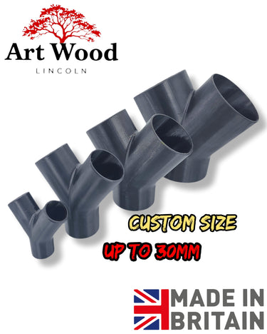 A versatile Y splitter designed for dual dust extraction setups in woodworking. Perfect for routing air from multiple sources—combine extraction at your router table base with fence-mounted collection, or connect both table saw and crown guard systems simultaneously. Hose connections that slip over the Y piece ports; secure with clamps, cable ties, tape, or adhesive as needed. Custom configurations available up to 30mm each port. We stock sizes from 30mm up to 100mm and larger, so you'll likely find what you need.