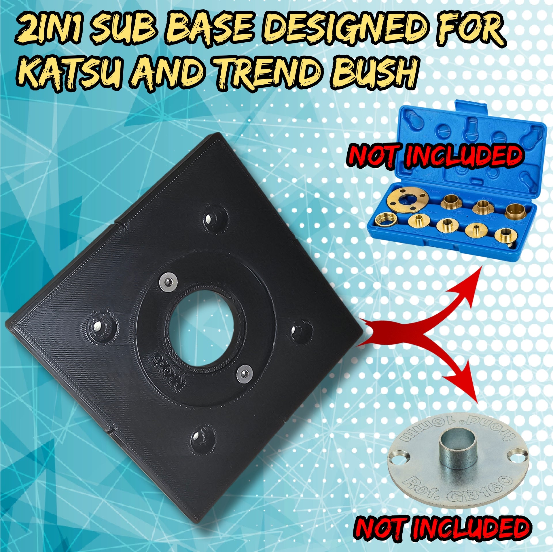 This is a 3D printed replacement router base 2in1 to fit the router and guide bushes Trend 60mm and Katsu (not included).