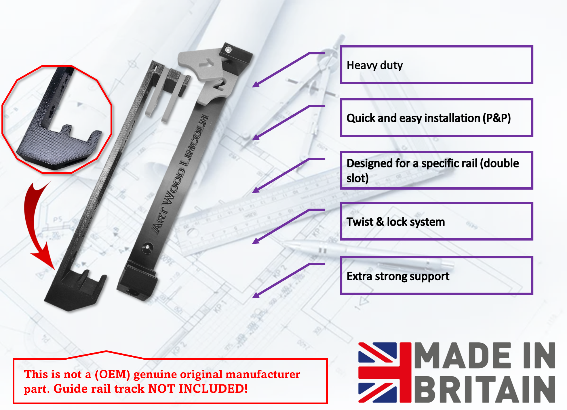 Track saw guide rail wall mount keep your workshop organized and your guide rails protected with this practical wall storage solution. Designed for specific track saw guide rails, this sturdy mount secures your equipment safely out of the way while maintaining easy access when you need it. Strong construction ensures reliable support, while the clean design fits seamlessly into any workshop setup. Ideal for woodworkers and DIY enthusiasts looking to maximize space and protect valuable tools from damage. Quick and easy to install, there is no need to modify anything, everything is plug&play.